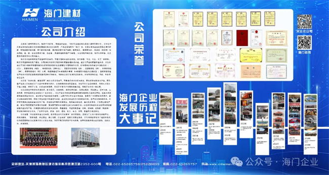 天津海门建材有限公司成立于1987年,原属军办企业(原隶属于52612部队),1996年企业改制为天津开发区海门建材有限公司,2010年更名为天津海门建材有限公司 。注册资金10600万,产品注册商标为“海门”牌,是专注于保温材料研发、生产、施工、服务于一体的保温专业化、综合型企业。公司在“科技创新、诚信经营”的企业宗旨指导下,专业研发和生产保温材料30余年,有着丰富的保温行业经验,不断进行技术创新与研发,迄今为止共获得专利技术25余项。